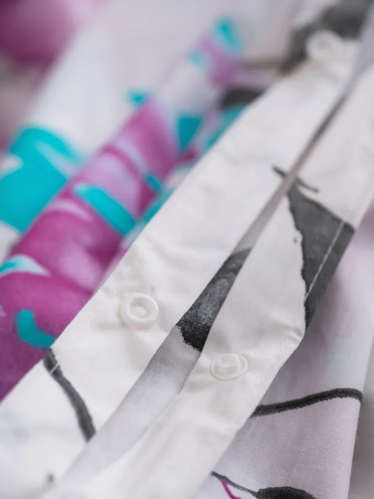 Отделка: пододеяльник : застежка – пластиковые кнопки под клапаном; наволочки: клапан; простыня: резинка по углам