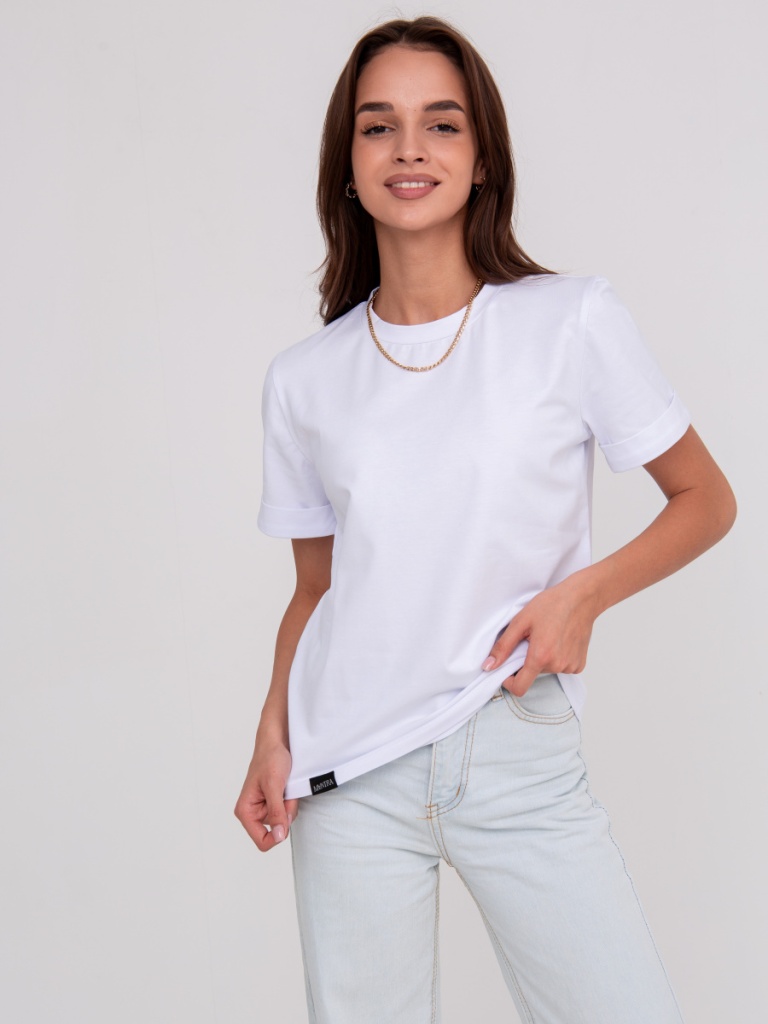 Футболка базовая однотонная из кулирки с лайкрой. Манжеты на рукавах.