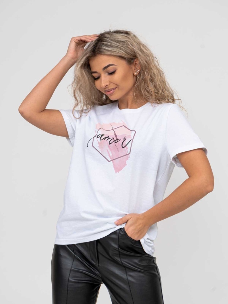 Футболка женская, прямого силуэта с принтом, О-образной горловиной. Рукав короткий, свободный. Футболка выполнена из трикотажного полотна 100% хлопка.