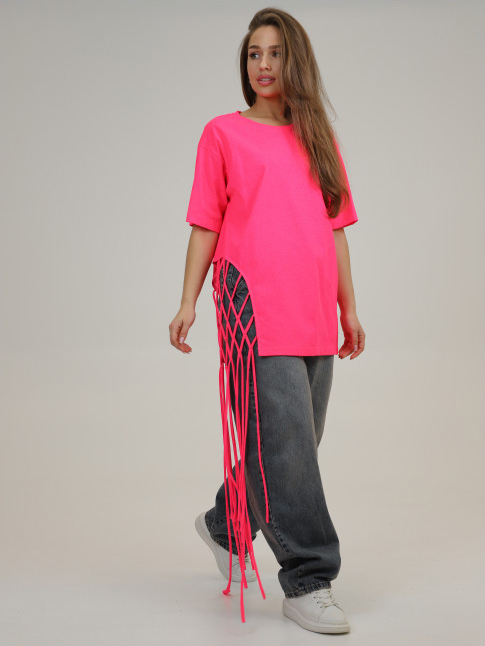 Яркая удлиненная футболка с декоративным плетением. Выполнена из 100% хлопка.