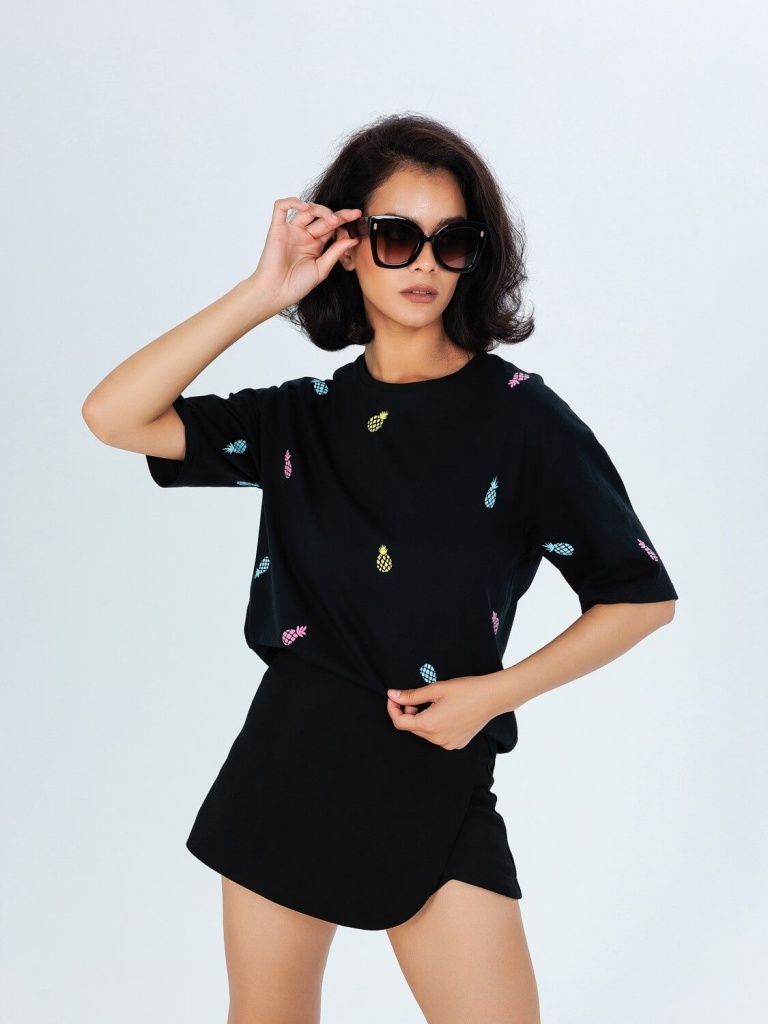 Футболка – свободного покроя, со спущенной линией плеч, втачными короткими рукавами, горловиной овальной формы, обработанной притачной планкой и принтом на полочке, выполненным в технике «шелкографии».