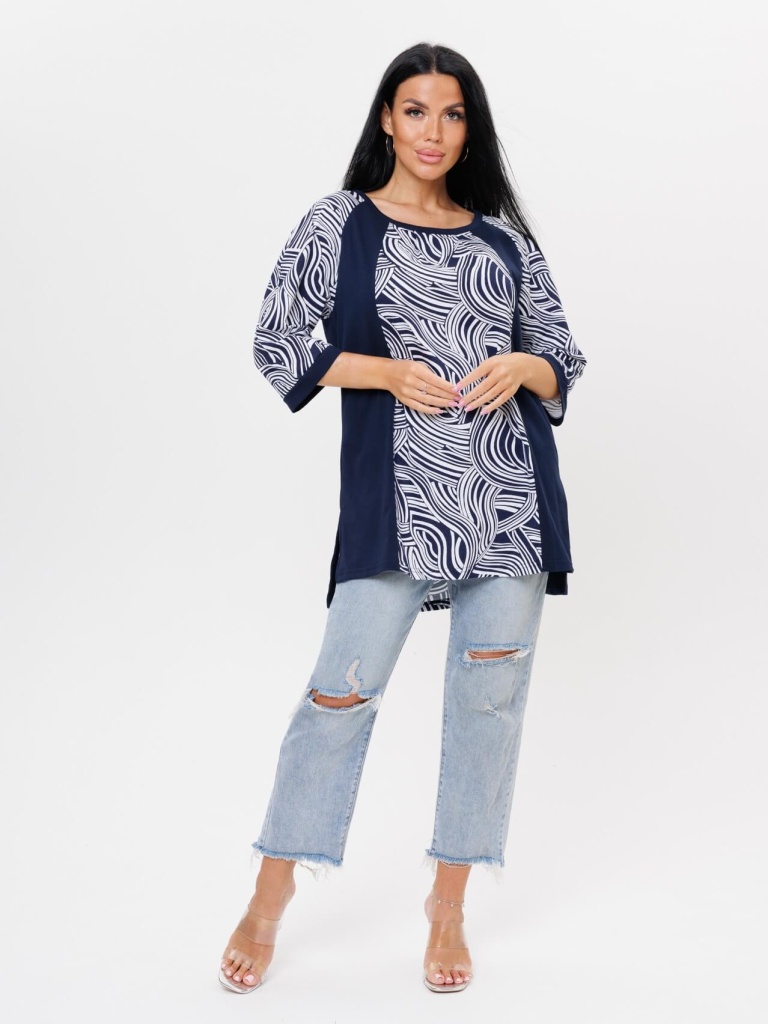 Женская футболка 2041/1 / Чернильный с рукавами 3/4, с контрастными вставками по бокам отшивается из трикотажного полотна - кулирки (100% хлопок). Футболка с разрезами по бокам имеет широкий размерный ряд от 60 до 70 размера.