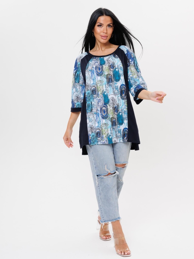 Женская футболка 2041 / Синий с рукавами 3/4, с контрастными вставками по бокам отшивается из трикотажного полотна - кулирки (100% хлопок). Футболка с разрезами по бокам имеет широкий размерный ряд от 60 до 70 размера.
