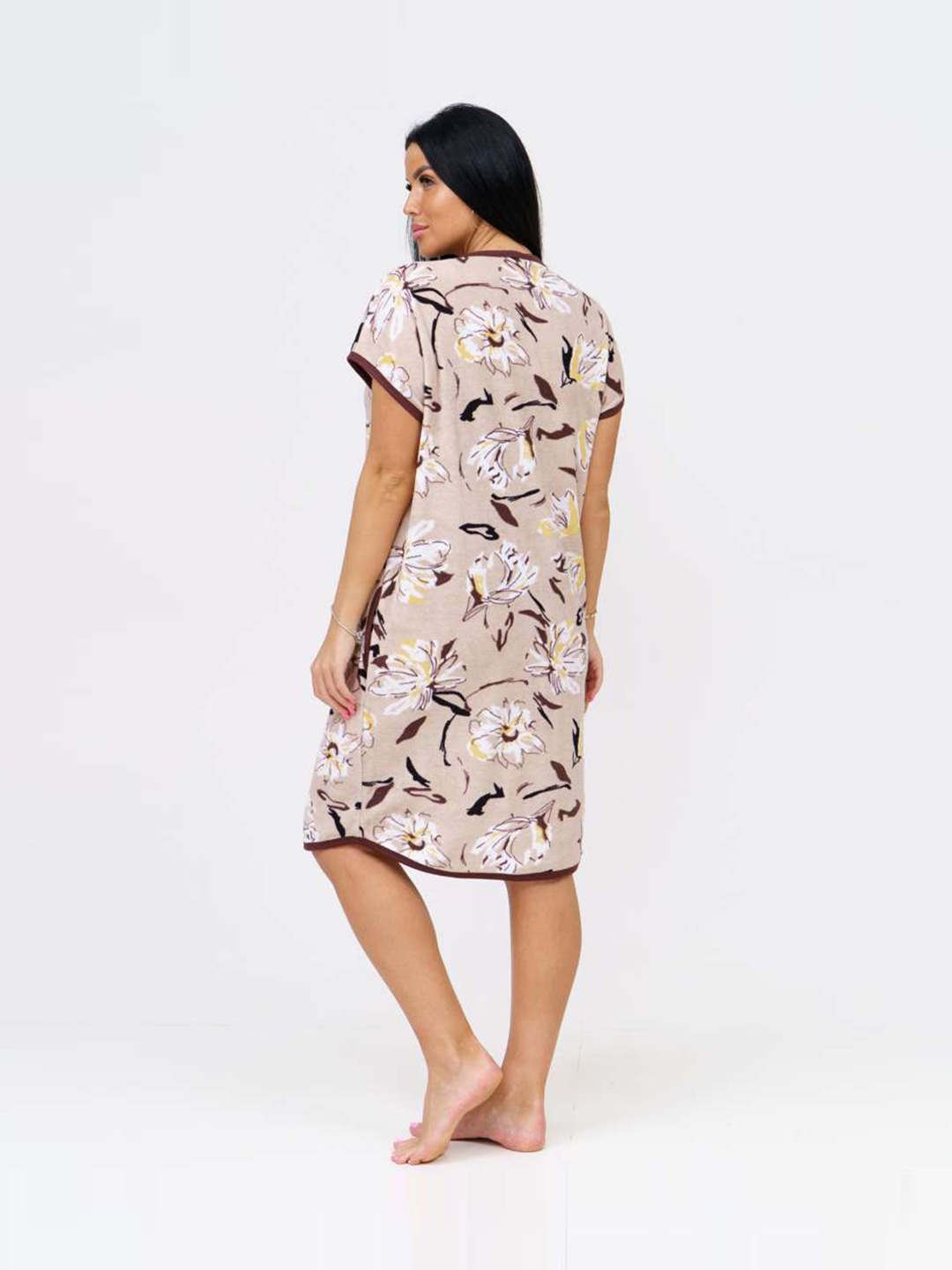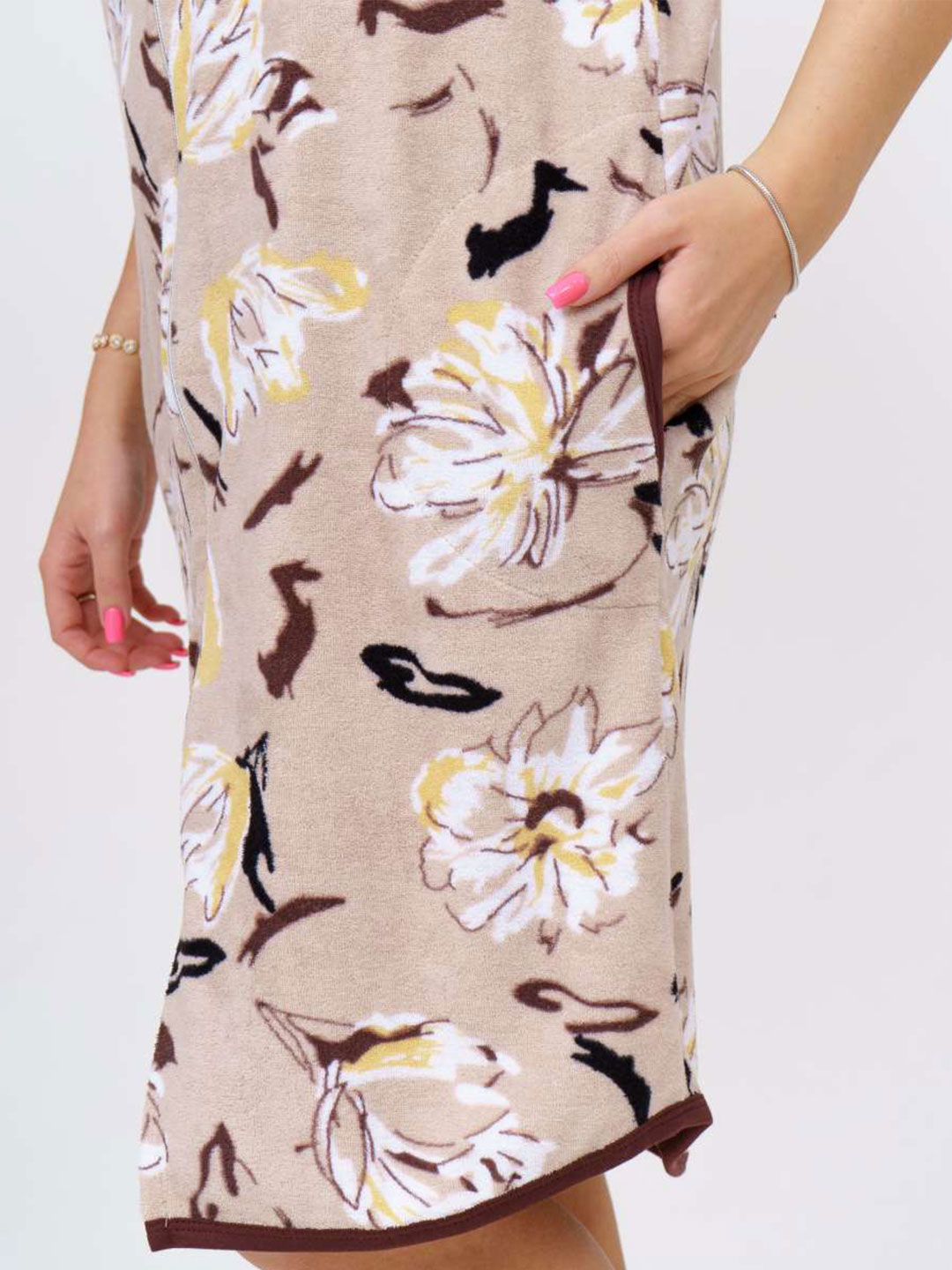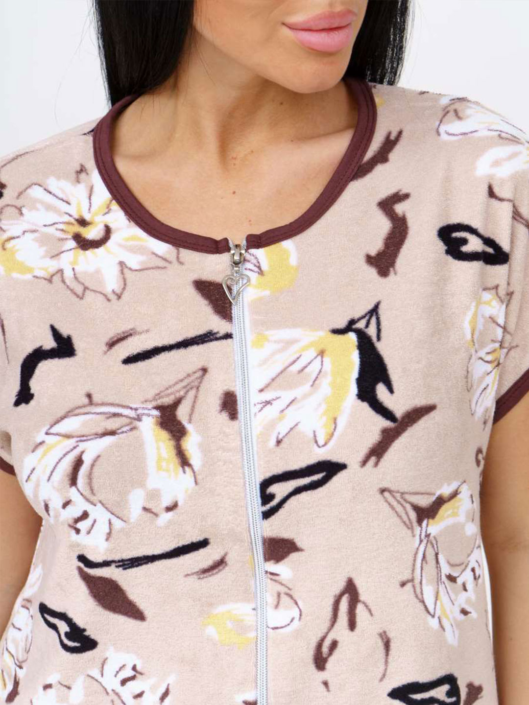 Женский домашний халат, полуприлегающего силуэта с застежкой на молнию. Два втачных кармана. О - образный вырез горловины.
