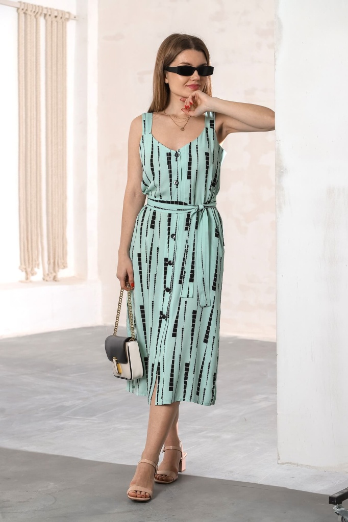 Сарафан женский из тканого штапельного полотна с набивным рисунком, удлиненный, слегка расширенный книзу, с широкими бретелями, глубоким вырезом горловины, центральной бортовой застежкой на обметанные петли и пуговицы, карманами и разрезами в боковых швах. На полочках - вытачки в области груди. Изделие укомплектовано съемным поясом, завязывающимся вокруг талии.