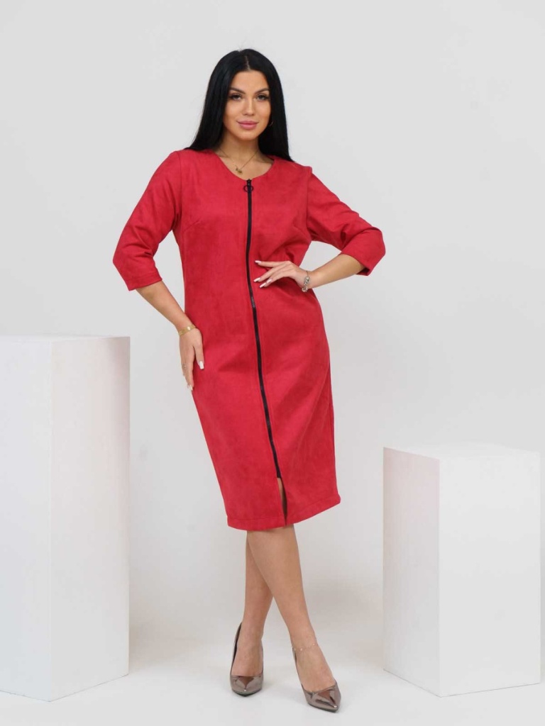 Замшевое женское платье с рукавами 3/4, на тракторной молнии спереди. Одинаково хорошо подходит и для повседневной работы в офисе и для праздничных мероприятий и городских прогулок. Платье без карманов и лишних элементов. Подчеркнет все достоинства фигуры и скроет недостатки.