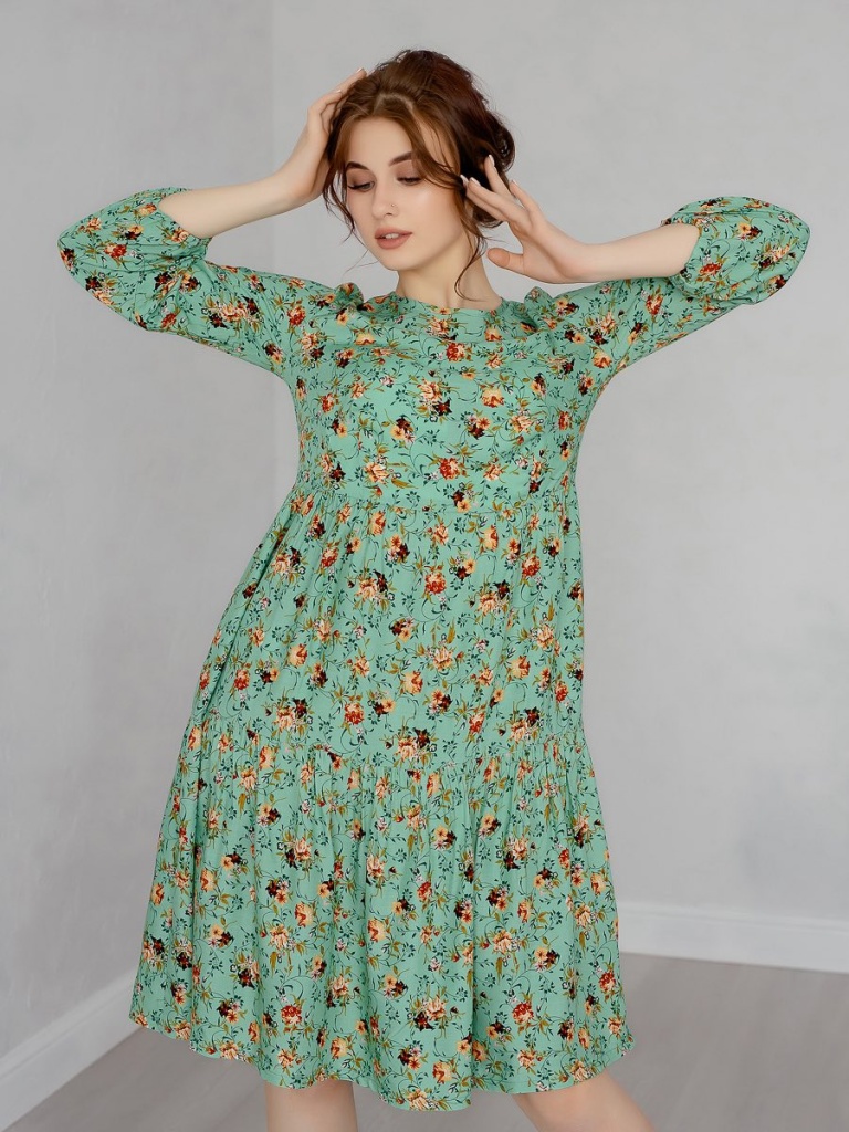 Женское летнее платье из струящейся вискозы (штапель) станет незаменимой вещью в гардеробе каждой женщины. Платье длиной до колена – отличный выбор для жаркого сезона, когда хочется выглядеть красочно и ощущать легкость движений. Модель с длинной рукава 7/8 на резинке, завязки на спине позволяют подогнать изделие под свои параметры. Округлый вырез элегантно дополняет общий облик, а цветочный принт на ткани добавляет женственности и утонченности. Оборки на подоле придают платью легкость и воздушность. Вы можете носить его на отдыхе, в офисе или дома. Благодаря свободному крою подойдет для всех женщин, в том числе и для беременных и кормящих мам. Эта модель идеально сочетается с легкими туфлями, сандалиями, кроссовками, кедами, Вы можете создавать комплект, который подарит максимальный комфорт и стильный внешний вид.