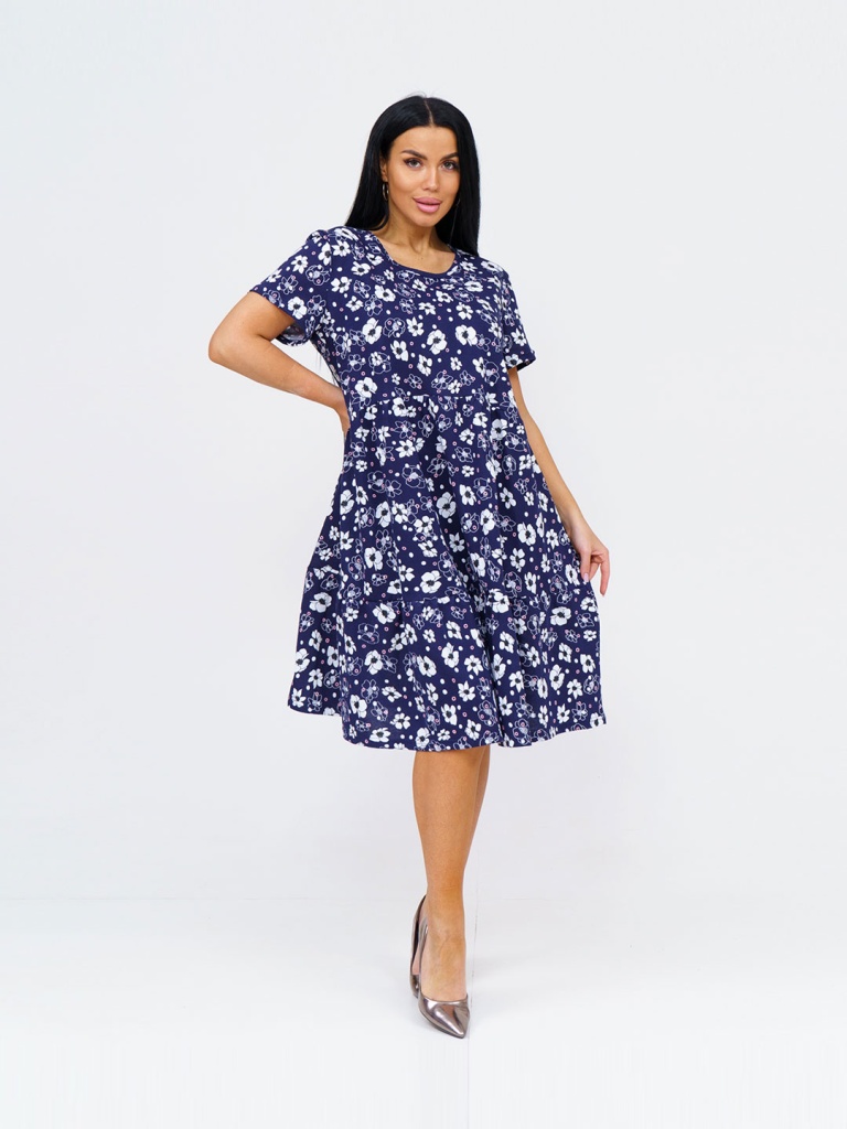 Женское летнее платье 1738-11 / Синий из 100% хлопка, полуприлегающего силуэта, длиной ниже уровня колена, рукав короткий, горловина О-образная. Платье идеально подойдет для жаркого летнего дня.