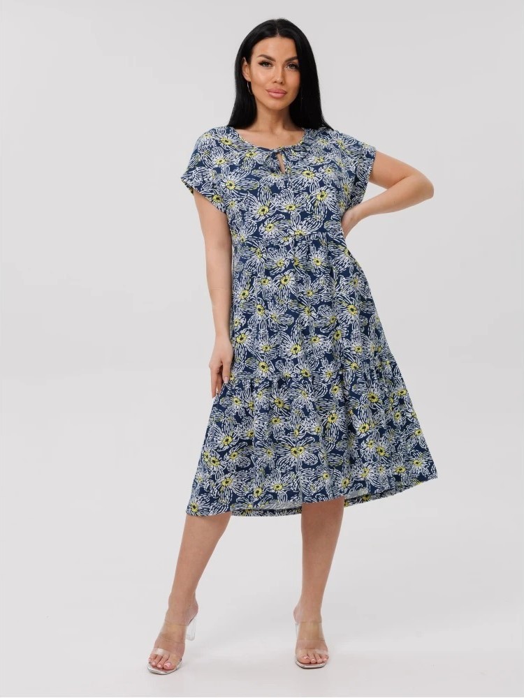 Женское платье Пл-64(К) / Синий (цветы) с короткими рукавами из кулирки. Женское летнее трикотажное платье станет отличным вариантом для прогулок или в качестве домашней одежды.