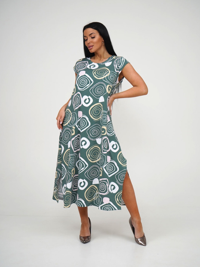Платье 1475-10 / Зеленый в стиле бохо с карманами, с высокими разрезами по бокам, О-образной горловиной, фигурным рукавом, длины миди. Платье отлично подойдет для отпуска на море.